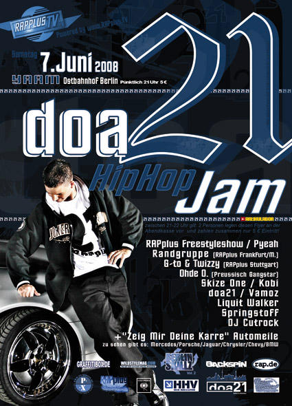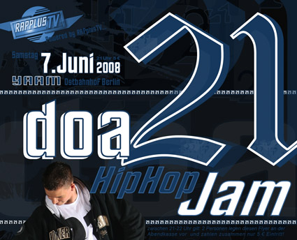 Feiern, Feiern, Feiern... Mit richtigen HipHop Headz! RAPplusTV & doa21 feiern was das Zeug hält! Am 7. Juni werden alle Heads aus dem RAPplus Deutschland Projekt im YAAM Berlin zusammen kommen um so richtig derbe abzufeiern. Bei der letzten RAPplus Jam wurde aus der privaten Party schnell ein Insider Tip zu dem sich ganze 500 Gäste hingezogen fühlten. Nun ist die Party eine öffentliche Jam für jeden HipHop Head! Für Gäste die nicht aus Berlin kommen hat RAPplus auch noch eine günstige Übernachtungsmöglichkeit am Start (PN bei Bedarf senden).