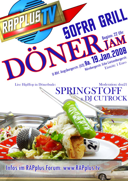 wie organisiert man eine anständige Party mit Langzeitwirkung? Man nehme sich seinen Lieblingsdönerladen, haue in die nur 50 Personen große Verkaufsfläche eine 1400 Watt Beschallungsanlage neben die Gäste und bucht dazu Top-Partyacts wie das SPRINGSTOFF Team aus BerlinCity und DJ Cutrock. Noch schnell paar Flyer unters Volk gebracht und die Sache wird ernst. Am 19. Januar 2008 ab 22 Uhr wird Mr.RAPplusTV aka doa21 in seiner Dönerbude eine HipHop Jam springen lassen. Alle Heads sind eingeladen sich das Spektakel mit reinzuziehen. Einen Platz in der Hütte wird man nur schwer bekommen, allerdings wird das Vergnügen auch vor der Tür Spaß machen. 3 Kameras von RAPplusTV werden zum Einsatz kommen um in der nächsten Sendung über dieses einmalige Partyereignis zu berichten. Also Leute, wir sehen uns alle in Berlin am 19. Januar in der Nürnbergerstraße Ecke Lietzenburgerstraße wenn es heißt, Liverap mit oder ohne Knoblauchsoße?
